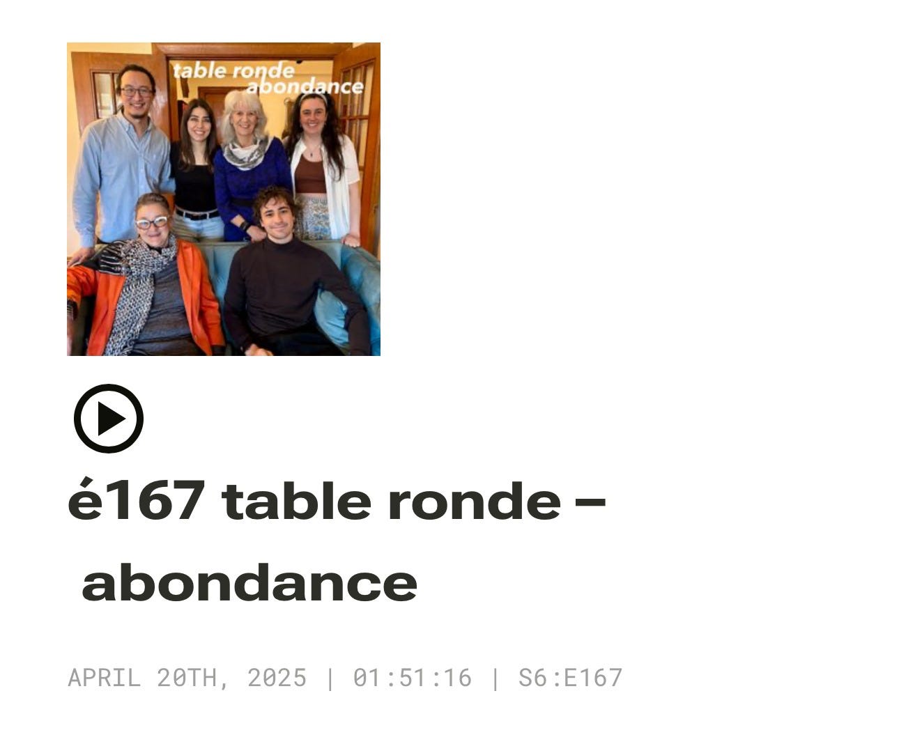 Ces 4 extraits proviennent de la première table ronde du balado conscient, é167 table ronde – abondance, enregistrée le 13 avril 2025 à Montréal avec Monique Savoie, Jimmy Ung, Rasha Masalkhi, Antonia Leney-Granger, Alexis Curodeau-Codère, Louise Poulin et moi-même.