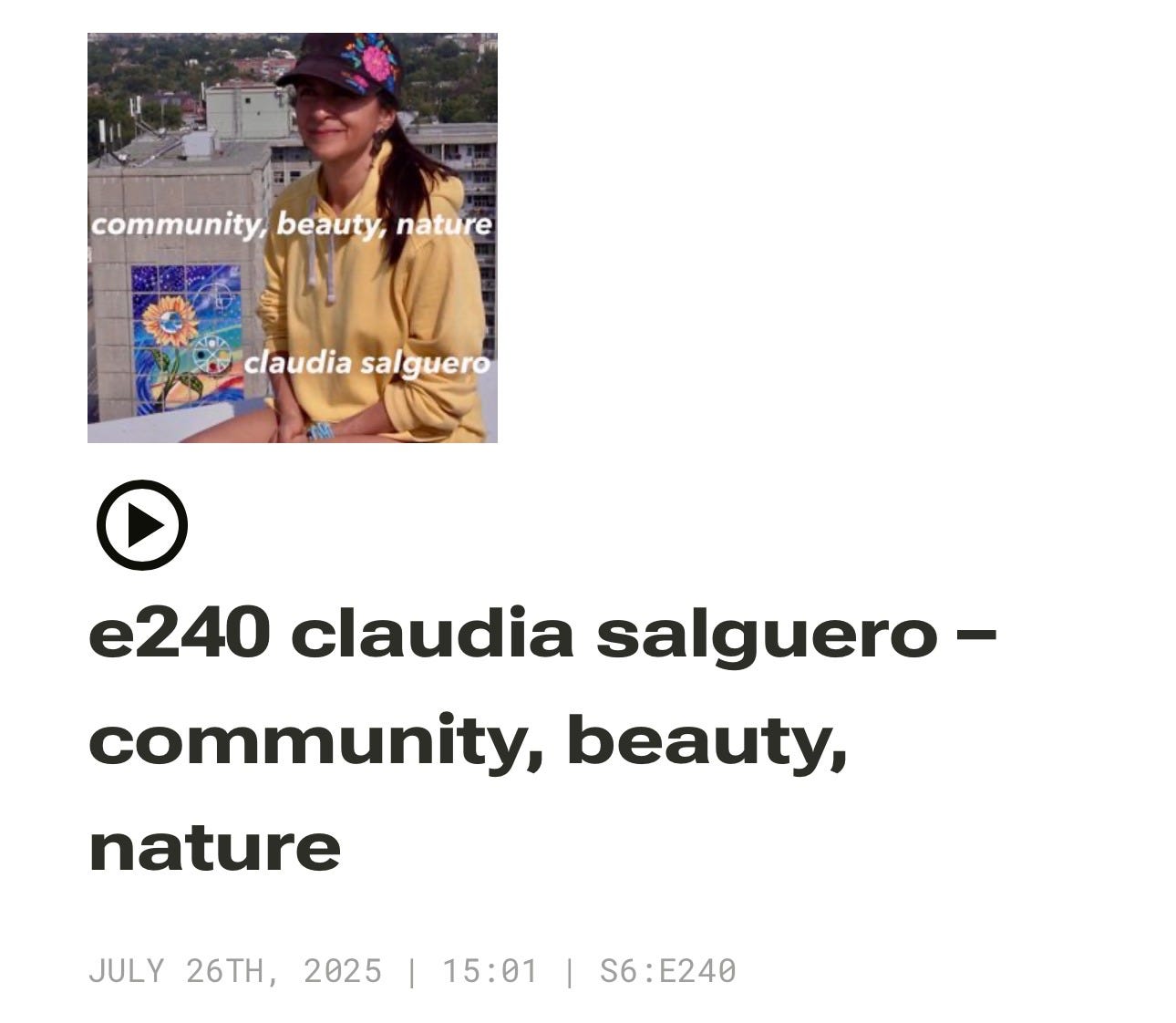 This excerpt is from e240 claudia salguero – community, beauty, nature and was recorded on July 8, 2025 at my home in Ottawa.