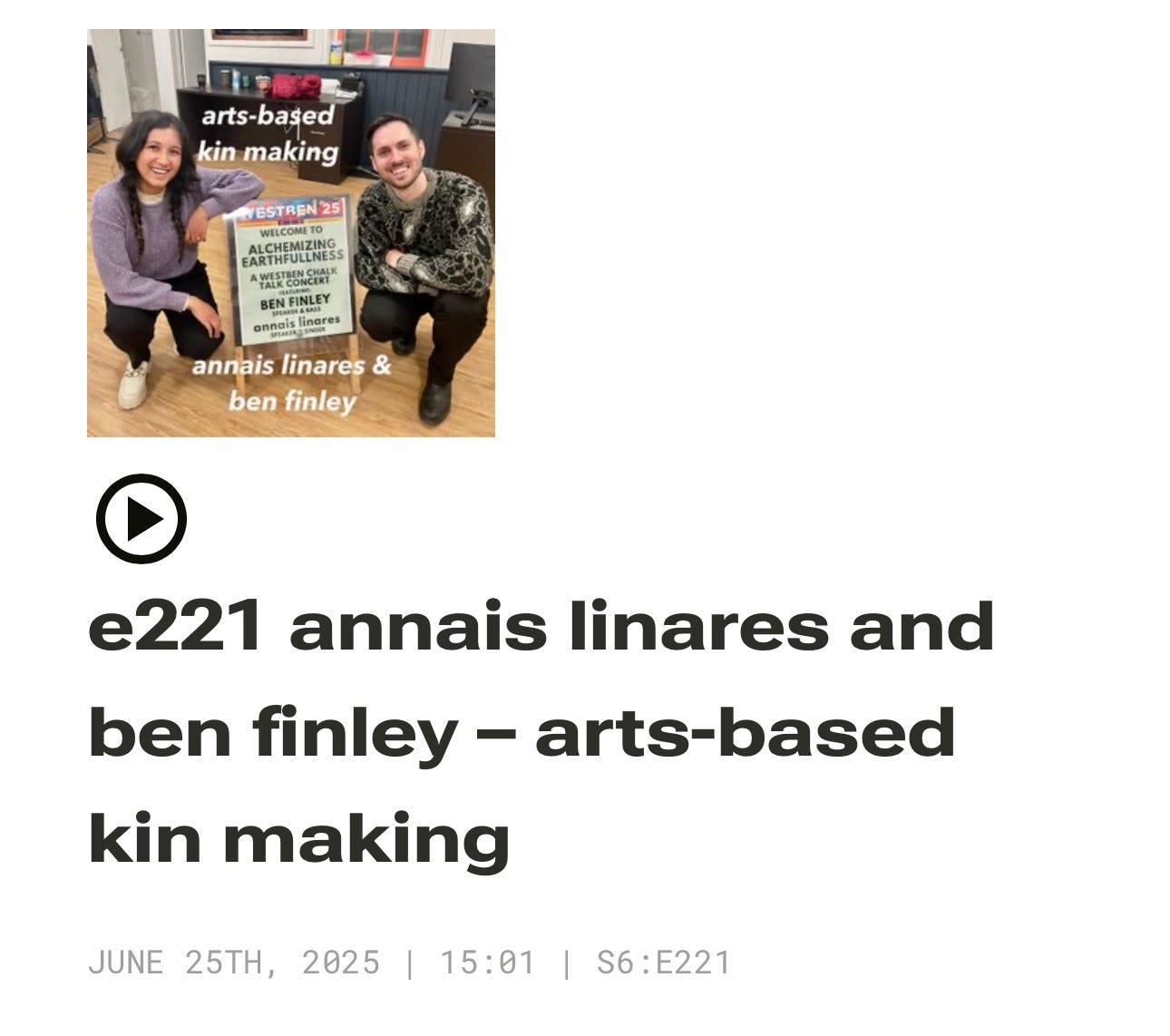 I love the vitality and calm in annais’ voice as she invites us to create moments of grounding, of rootedness and remembering our real belonging to this earth and to consider how arts-based kin making can help us reconnect and transform the world.
