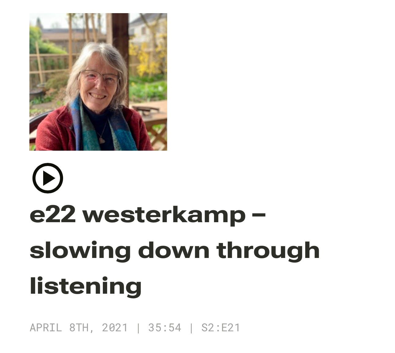 The final excerpt of this set of 12 is from e22 westerkamp – slowing down through listening, my conversation with composer Hildegard Westerkamp recorded on March 31, 2021 in the backyard of Hildi’s home in Vancouver, on the ancestral lands of the Coast Salish peoples - the Squamish (Sḵwx̱wú7mesh), Tsleil-Waututh (Stó:lō and Səl̓ílwətaʔ/Selilwitulh), and Musqueam (xʷməθkʷəy̓əm) Nations.